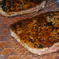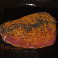 - Heat about 1T oil per piece of tuna you are cooking at once(I do only 2)in medium, heavy skillet(I used cast iron) over medium high heat until just at smoking point.