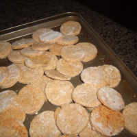 - 5. Roll or pat out dough to 1/2 " thickness. Cut with cookie cutter and place 1" apart onto prepared cookie sheets.