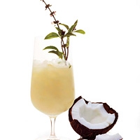 - Add ice and the vanilla-spiced rum, coconut milk and lime juice and shake well.